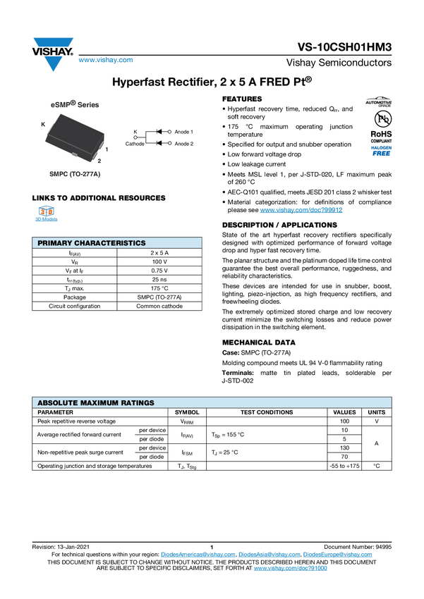 VS-10CSH01HM3 Hyperfast Rectifier, 2 x 5 A FRED Pt®