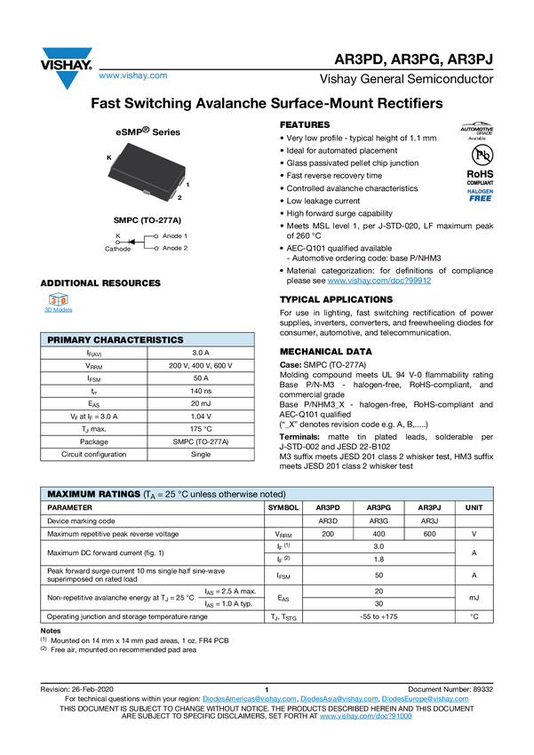 AR3PD Fast Switching Avalanche Surface-Mount Rectifiers