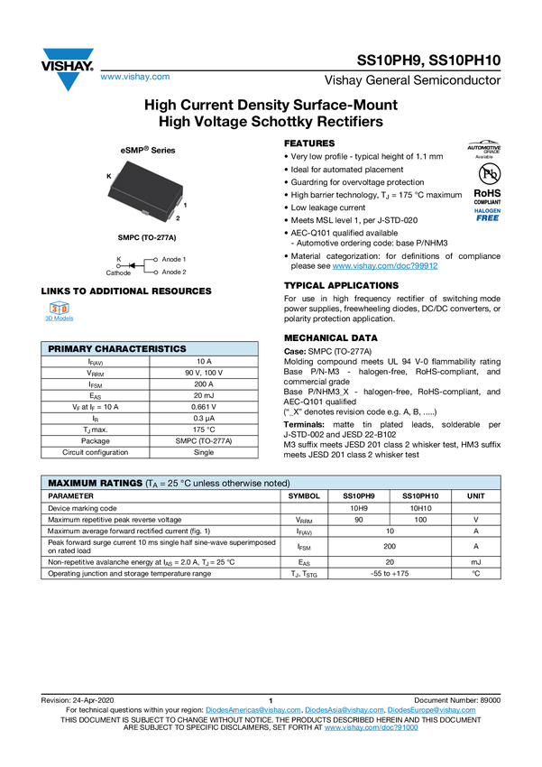 SS10PH10 High Current Density Surface-Mount High Voltage Schottky Rectifiers