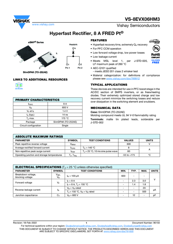 VS-8EVX06HM3 Hyperfast Rectifier, 8 A FRED Pt®