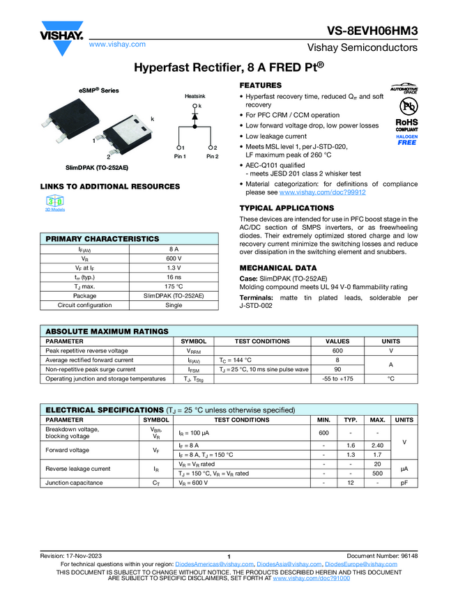 VS-8EVH06HM3 Hyperfast Rectifier, 8 A FRED Pt®
