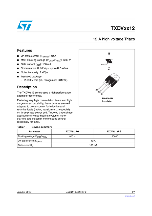 Triak; TXDV1212RG; 1,2kV; 12A; 100mA; TO220; THT; alternistor, wysokonapięciowa; ST MICROELECTRONICS; RoHS