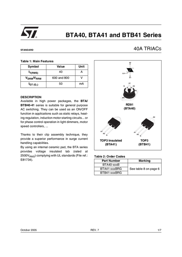 Triak; BTA40-800B; 40A; 800V; RD91; konektory; izolowany; 50mA; STMicroelecronics; RoHS