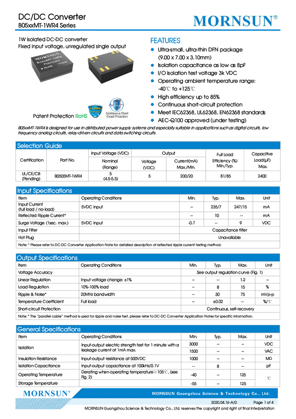 B0505MT-1WR4 Przetwornik; DC/DC; 1W; Uwej:4,5,5V; Uwyj:5V; 200mA; DFN14-7; SMD; MORSUN;...