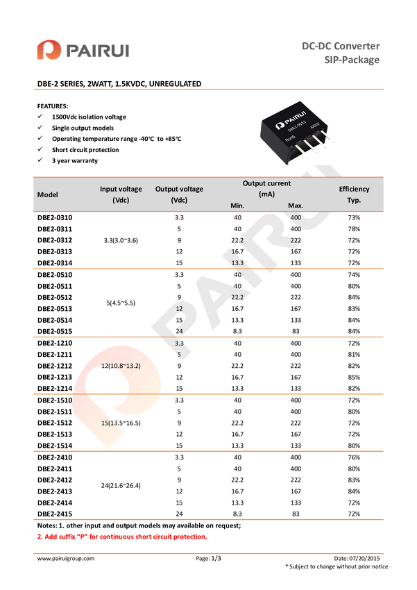 Przetwornik; DBE2-0513; DC/DC; 2W; Uwej:4,5-5,5V; Uwyj:12V DC; Iwyj:160mA; SIP4; PAIRUI; zamiennik dla AM2S-0512SZ; RoHS