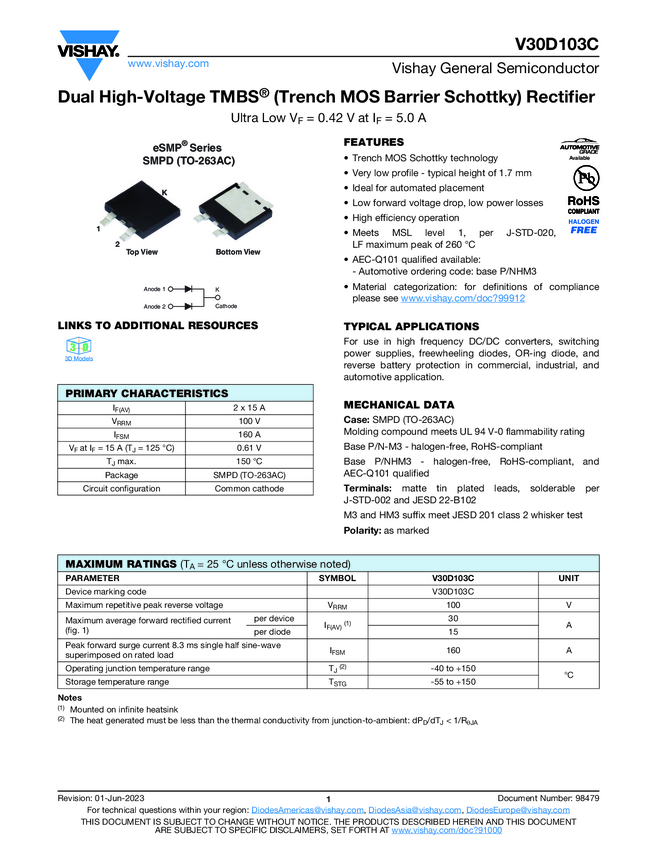 V30D103C Dual High-Voltage TMBS® (Trench MOS Barrier Schottky) Rectifier Ultra...
