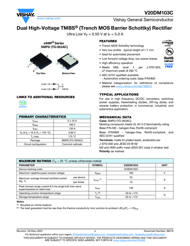 V20DM103C Dual High-Voltage TMBS® (Trench MOS Barrier Schottky) Rectifier Ultra...
