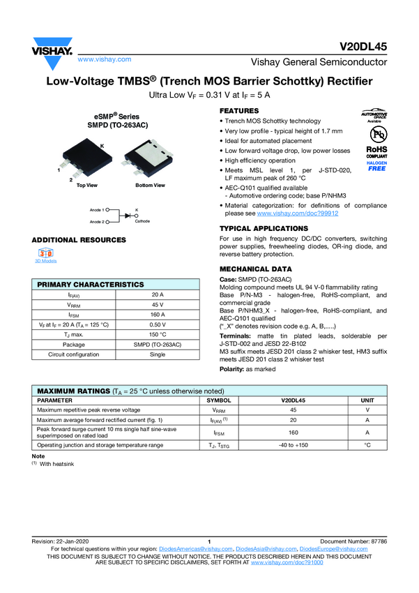 V20DL45 Low-Voltage TMBS® (Trench MOS Barrier Schottky) Rectifier Ultra Low VF...