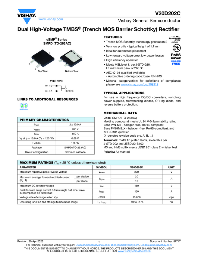 V20D202C Dual High-Voltage TMBS® (Trench MOS Barrier Schottky) Rectifier