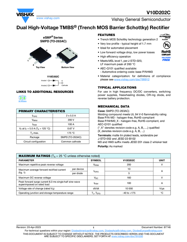 V10D202C Dual High-Voltage TMBS® (Trench MOS Barrier Schottky) Rectifier