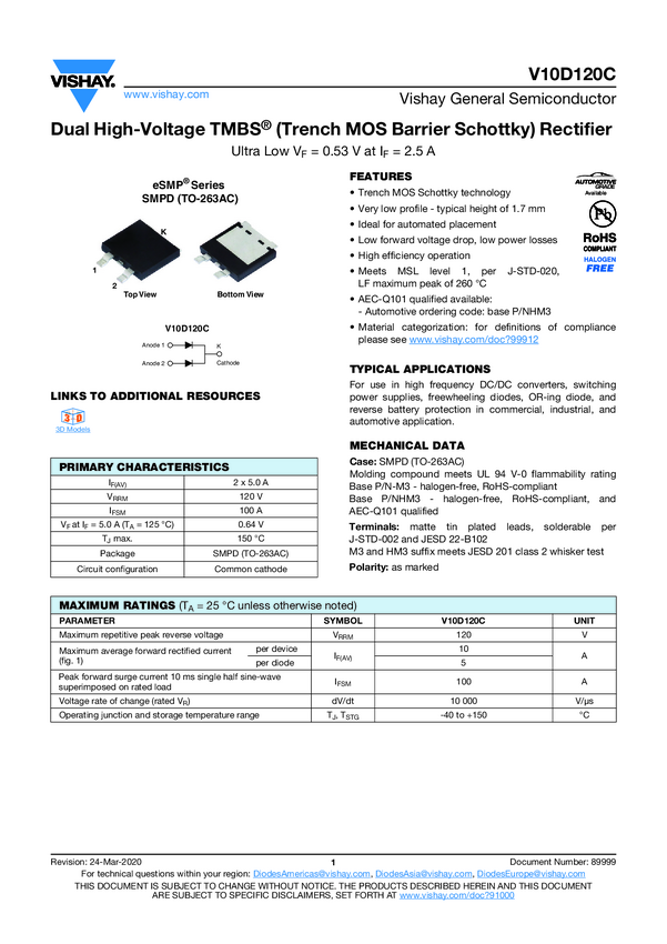 V10D120C Dual High-Voltage TMBS® (Trench MOS Barrier Schottky) Rectifier Ultra...