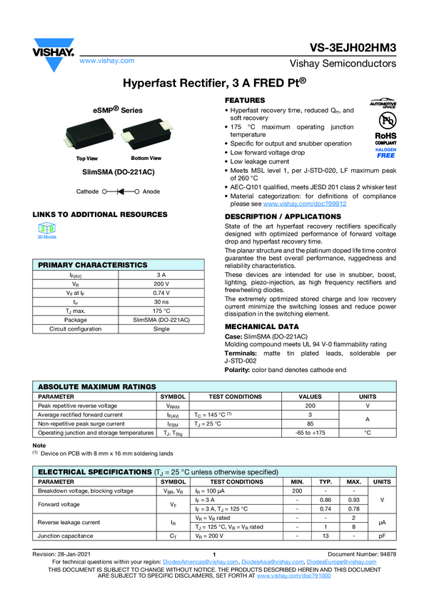 VS-3EJH02HM3 Hyperfast Rectifier, 3 A FRED Pt®