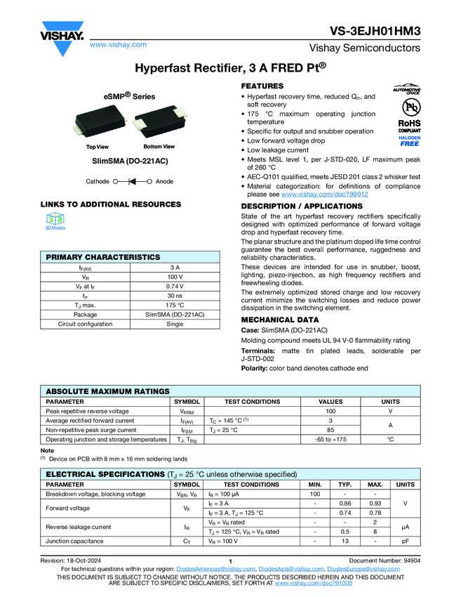 VS-3EJH01HM3 Hyperfast Rectifier, 3 A FRED Pt®