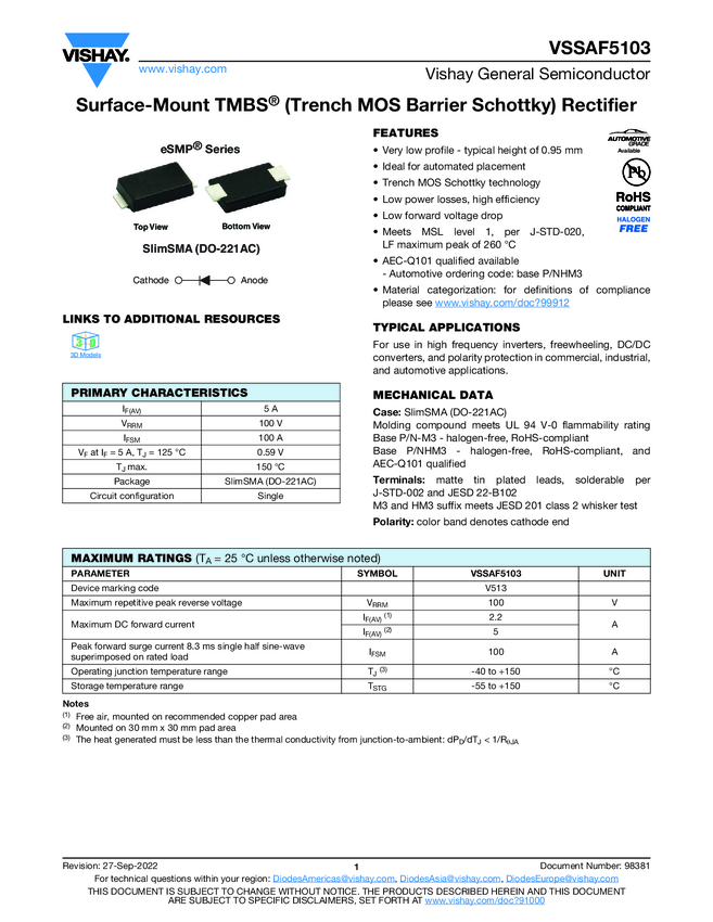 VSSAF5103 Surface-Mount TMBS® (Trench MOS Barrier Schottky) Rectifier