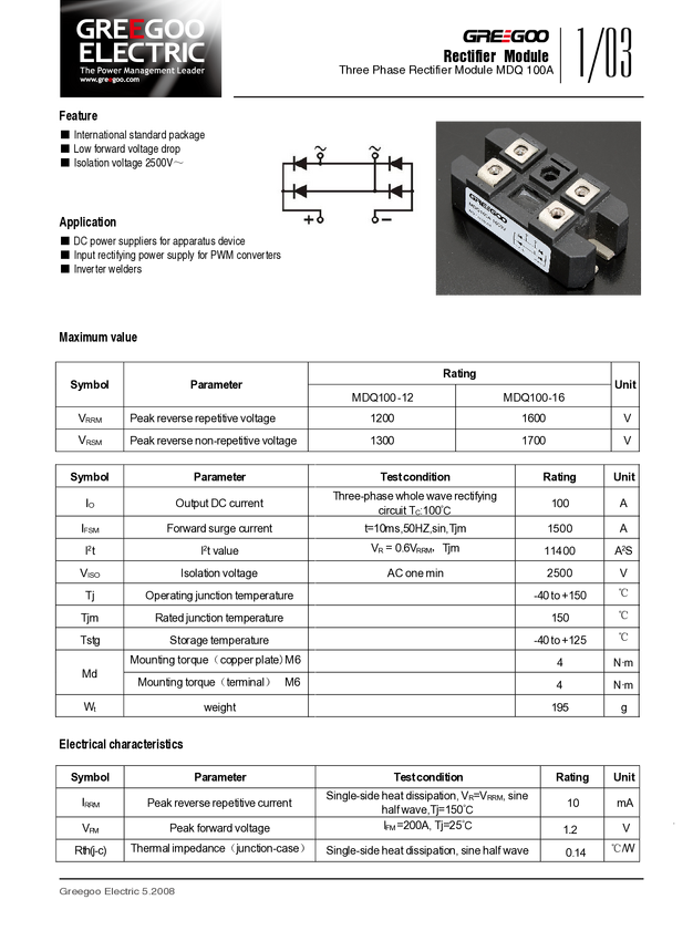 Mostek prostowniczy; MDQ-100-12; 100A; 1200V; przykręcany; 1 fazowy; 80x40x32mm; GREEGO; RoHS