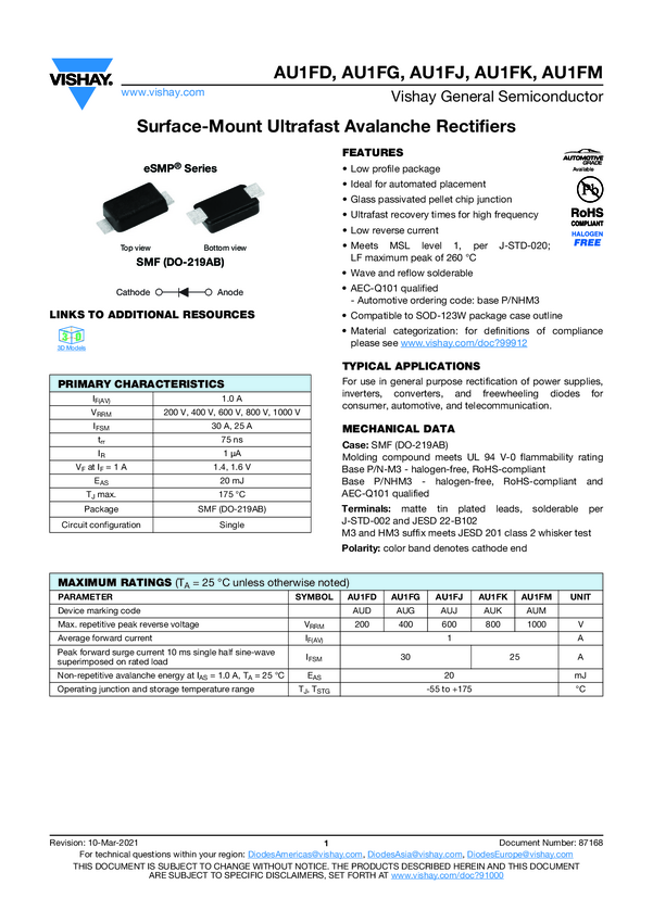 AU1FK Surface-Mount Ultrafast Avalanche Rectifiers