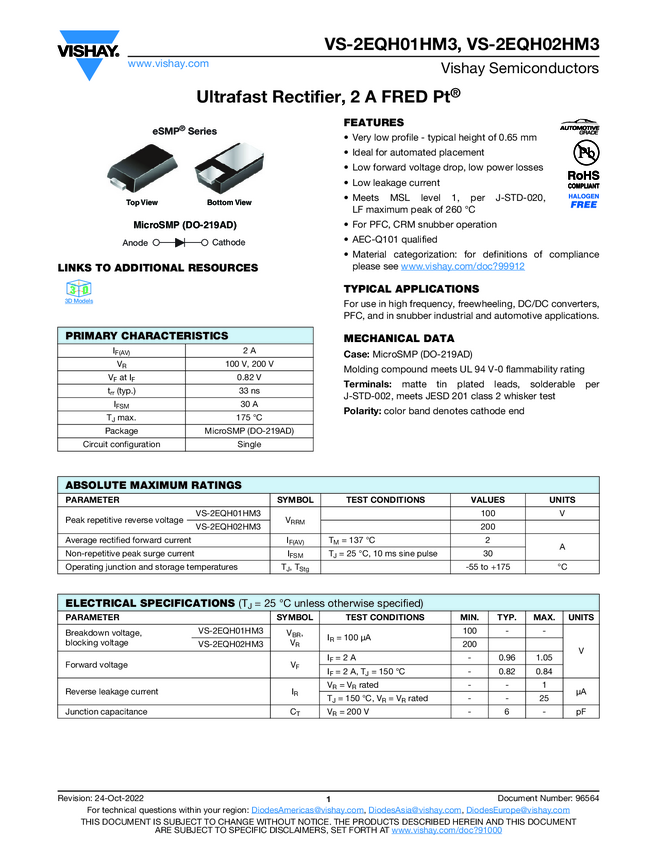 VS-2EQH01HM3 Ultrafast Rectifier, 2 A FRED Pt®