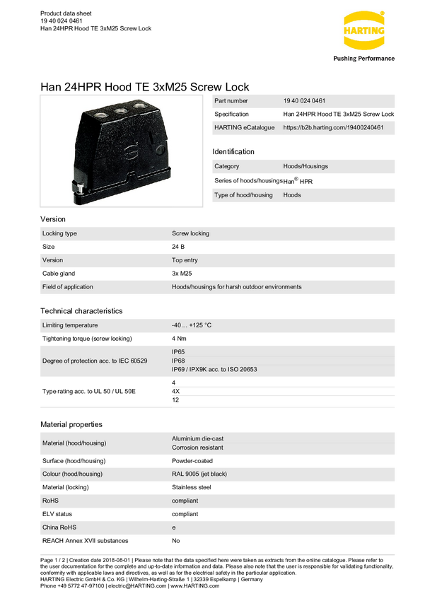 19 40 024 0461 Obudowa tulejki Harting 19 40 024 0461, odlew aluminium, 1 szt.