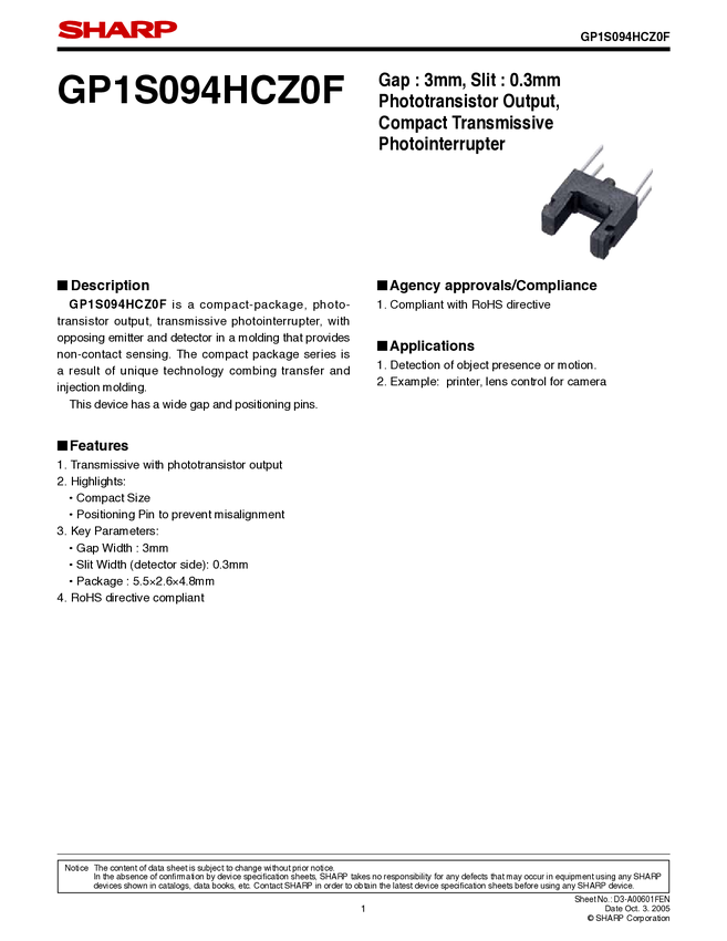 GP1S094HCZ0F Czujnik; GP1S094HCZ0F; transoptor szczelinowy; fotoelektryczny; nadajnik-od...