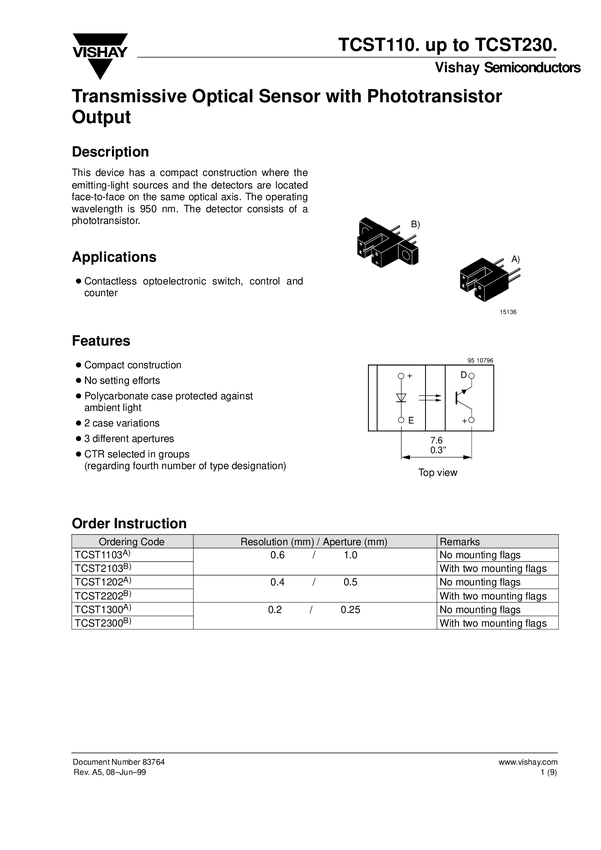 TCST2103 Czujnik; TCST2103; transoptor; szczelinowy; 70V; CTR@if:20%@10mA; Szer.szcz...