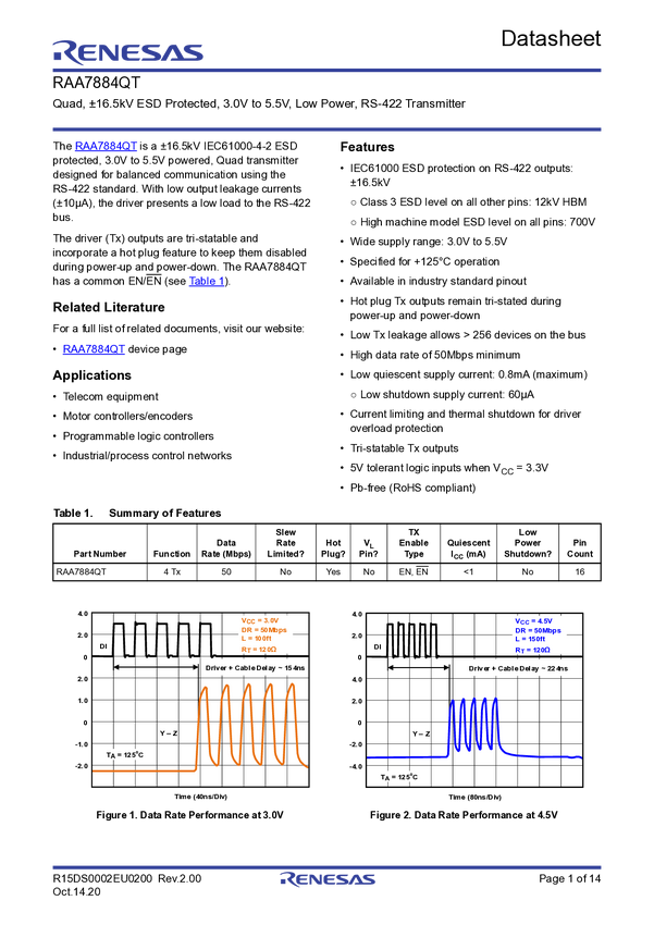RAA7884QT Quad, ±16.5kV ESD Protected, 3.0V to 5.5V, Low Power, RS-422 Transmitter