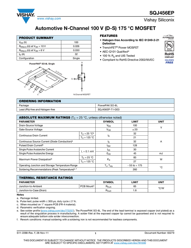 SQJ456EP Automotive N-Channel 100 V (D-S) 175 °C MOSFET