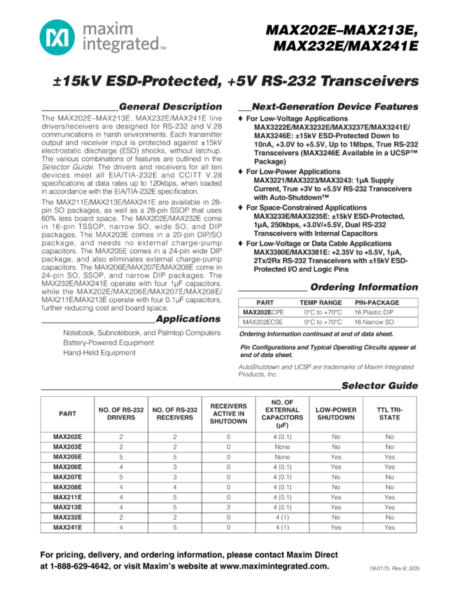 - MAX202E, MAX203E, MAX205E, MAX206E, MAX207E, MAX208E, MAX211E, MAX232E, MAX241E
