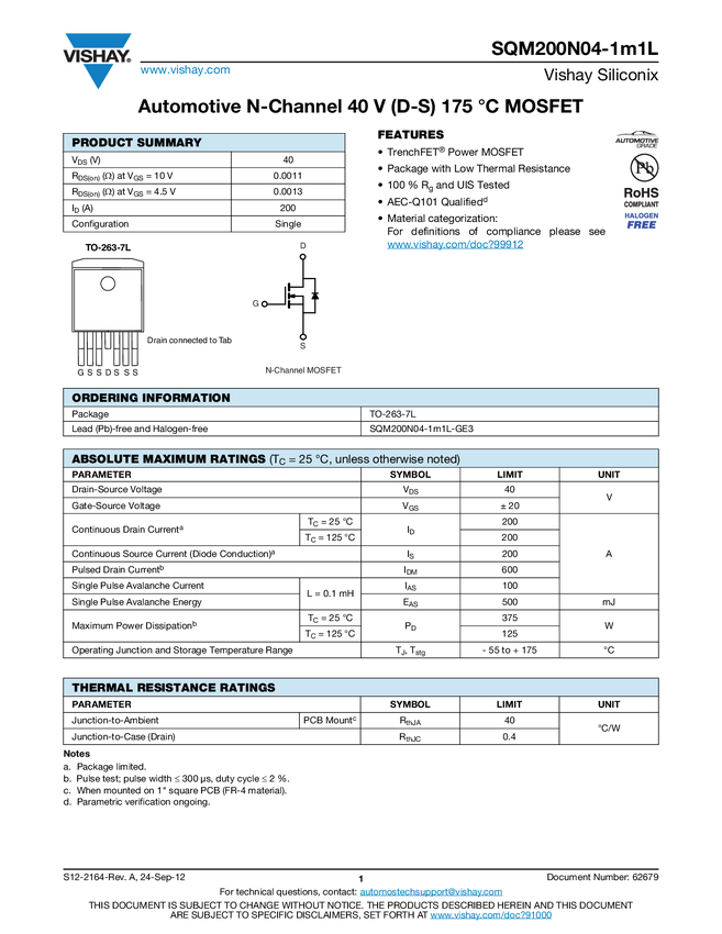 SQM200N04-1m1L Automotive N-Channel 40 V (D-S) 175 °C MOSFET