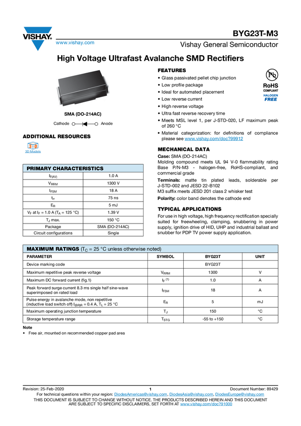 BYG23T-M3 High Voltage Ultrafast Avalanche SMD Rectifiers