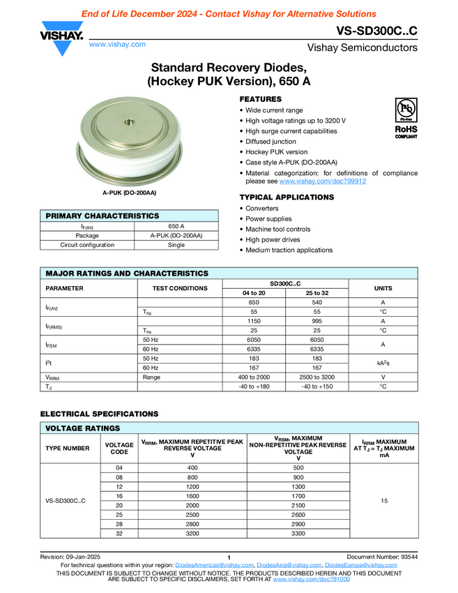 VS-SD300C..C Standard Recovery Diodes, (Hockey PUK Version), 650 A