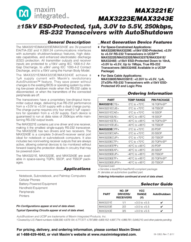 MAX3221E, MAX3223E, MAX3243E ±15kV ESD-Protected, 1µA, 3.0V to 5.5V, 250kbps, RS-232 Transceivers with AutoShutdown