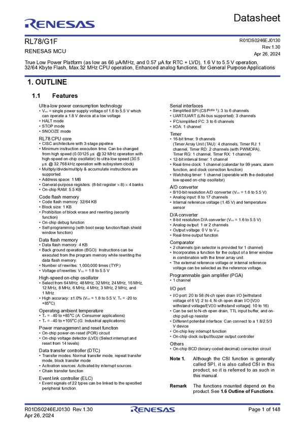 RL78/G1F Multifunctional Microcontrollers with Enhanced Functionality for Sensorless...