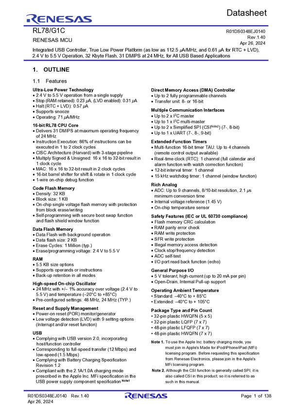 RL78/G1C Compact, Low Power Microcontrollers Supporting USB Communications and Rapid...