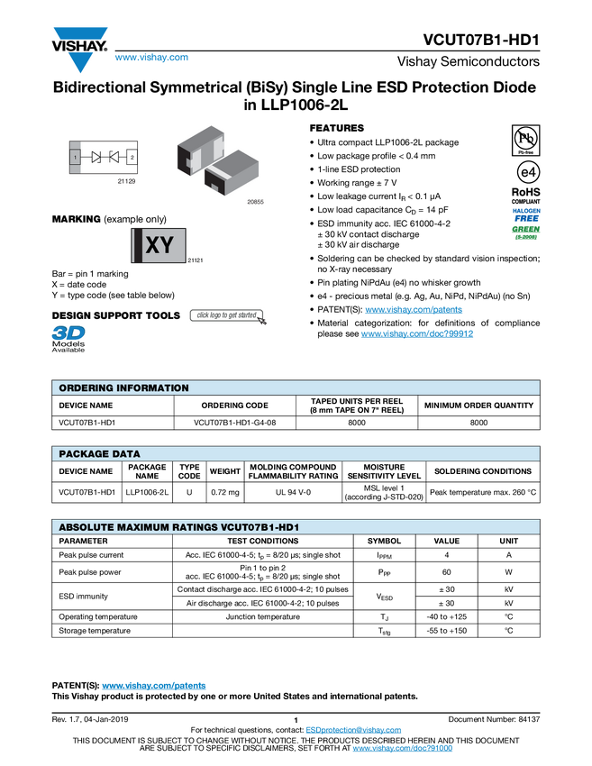 VCUT07B1-HD1 Bidirectional Symmetrical (BiSy) Single Line ESD Protection Diode in LLP100...