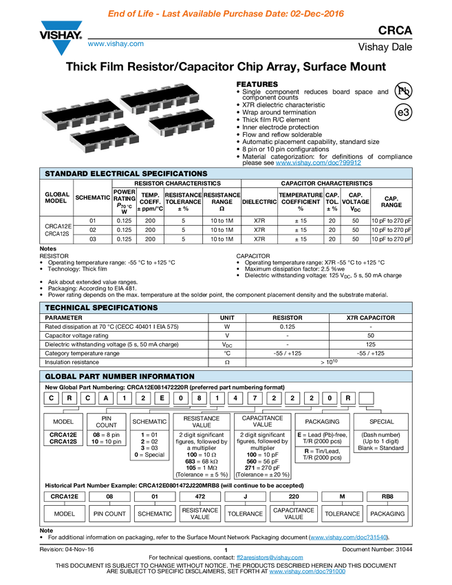 CRCA Thick Film Resistor/Capacitor Chip Array, Surface Mount