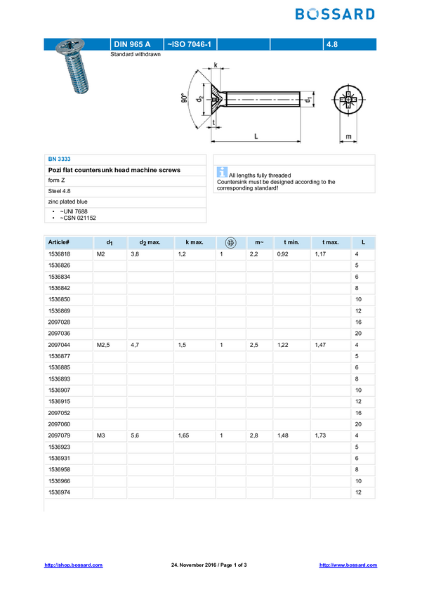 Śruba; M3x10; DIN: 965A; Łeb: stożkowy; Pozidriv; stal; cynk; PZ1; BOSSARD; 1536966; RoHS; opakowanie/100szt