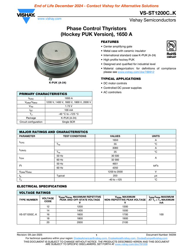 VS-ST1200C..K Phase Control Thyristors (Hockey PUK Version), 1650 A