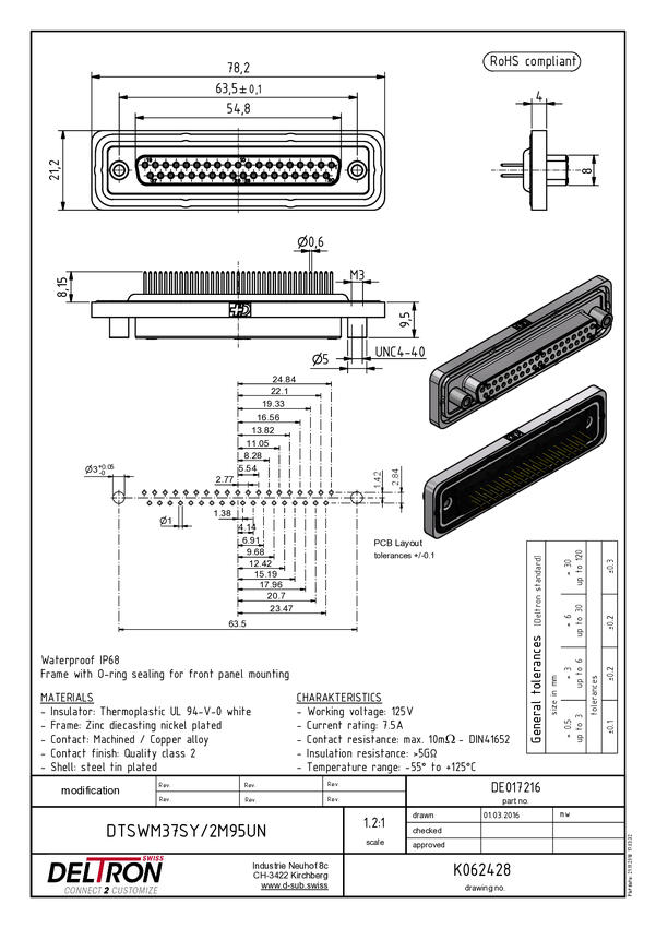 DTSWM37SY/2M95UN Deltron Connectors Deltron DTSWM37SY/2M95UN Złącze żeńskie D-Sub 180 °...