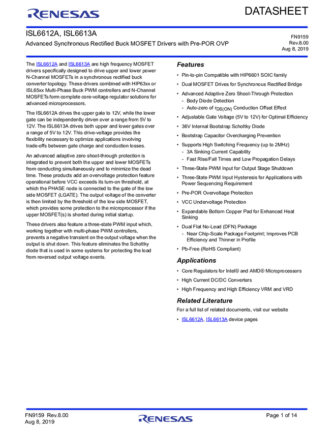 ISL6612A Advanced Synchronous Rectified Buck MOSFET Drivers with Pre-POR OVP