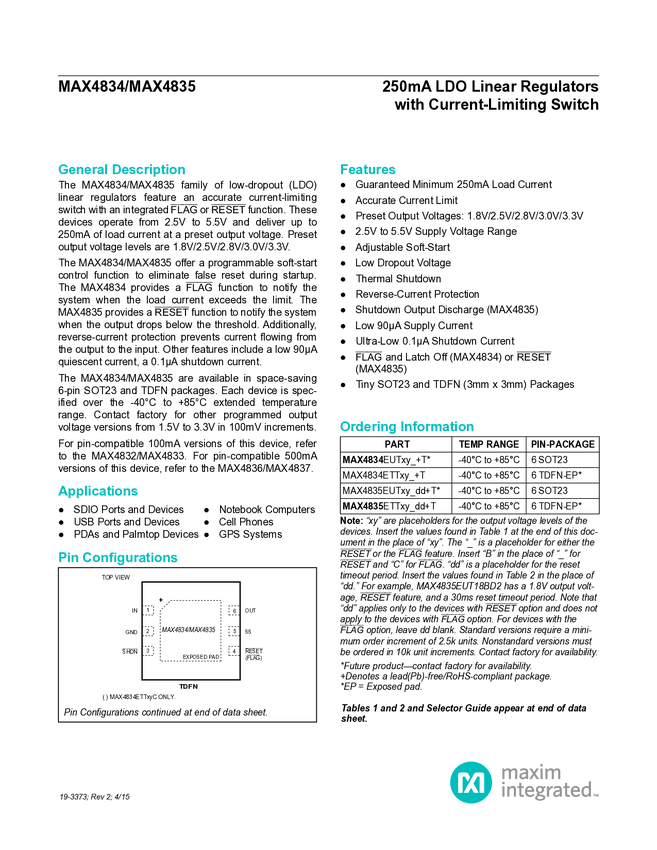 MAX4834 250mA LDO Linear Regulators with Current-Limiting Switch