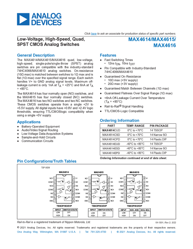 MAX4616 Low-Voltage, High-Speed, Quad, SPST CMOS Analog Switches