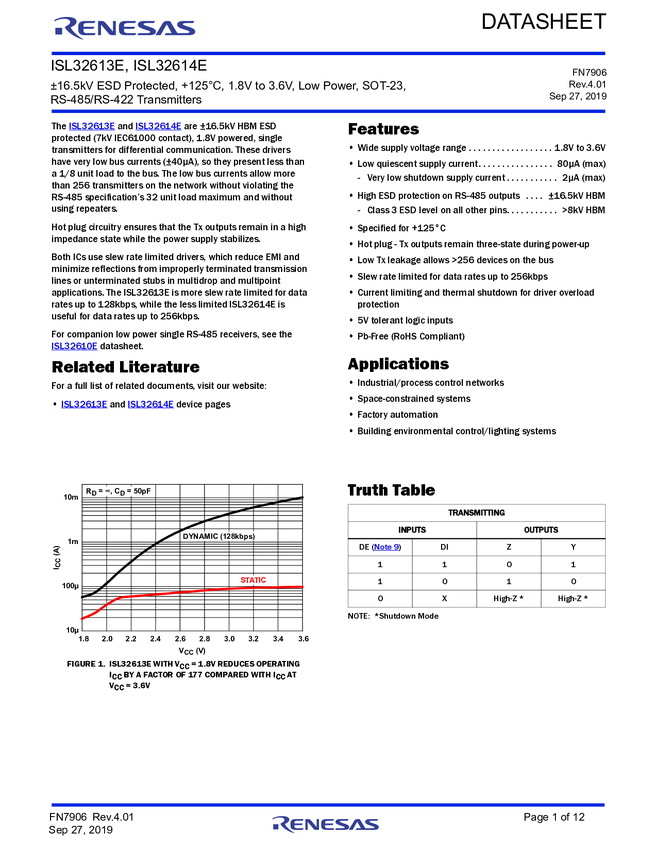 ISL32613E ±16.5kV ESD Protected, +125°C, 1.8V to 3.6V, Low Power, SOT-23, RS-485/RS-4...