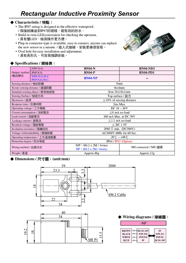 Czujnik; indukcyjny; RN04-NP; NPN/PNP; NO/NC; 5mm; 10-30V; DC; 100mA; prostokątny plastikowy; IP64; 18x18x29mm; z przewodem; RIKO; RoHS