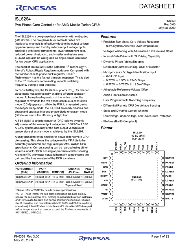 ISL6264 Two-Phase Core Controller for AMD Mobile Turion CPUs