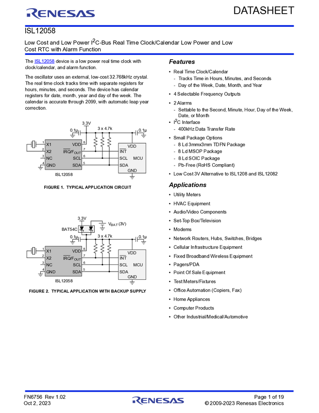 ISL12058 Low Cost and Low Power I2C Bus™ Real Time Clock/Calendar Low Power and Low...