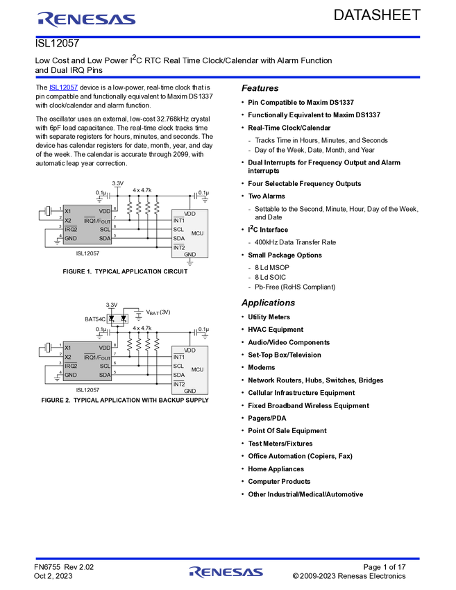 ISL12057 Low Cost and Low Power I2C Real Time Clock/Calendar with Alarm Function and...