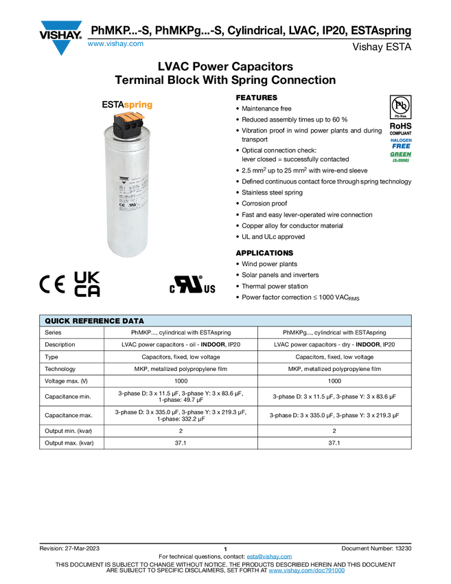 PhMKP...-S LVAC Power Capacitors Terminal Block With Spring Connection