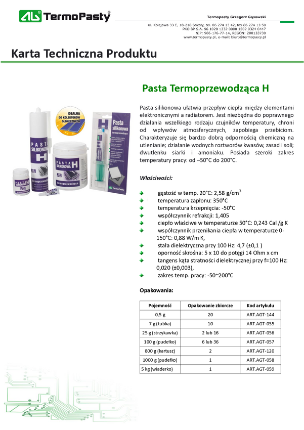 Pasta silikonowa; teromoprzewodząca; H; H/100g; 100g; 0,88W/mK; AG Termopasty; PASTA-HP-100; ART.AGT-057; RoHS