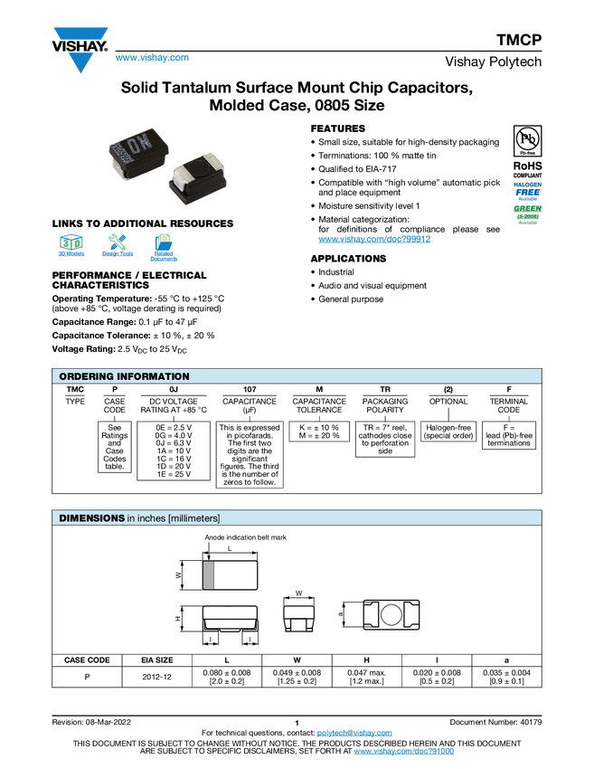TMCP Solid Tantalum Surface Mount Chip Capacitors, Molded Case, 0805 Size