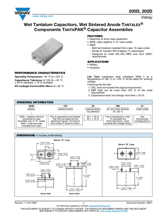 200D Wet Tantalum Capacitors Wet Sintered Anode TANTALEX® Components TANTAP...